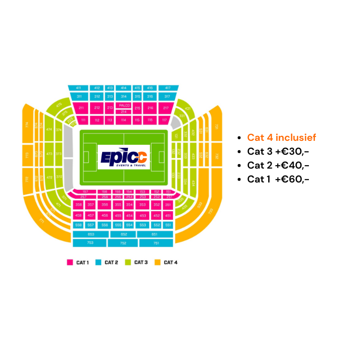 Zet bij opmerkingen eventuele allergieën, dieetwensen, upgrade Categorie Stadion plaatsen en bij meerdere personen de voorkeur voor het kamertype (tweepersoonskamer met tweepersoonsbed, tweepersoonskamer met twee aparte bedden of een eenpersoonskamer). Single kamer toeslag is €115,- per nacht.