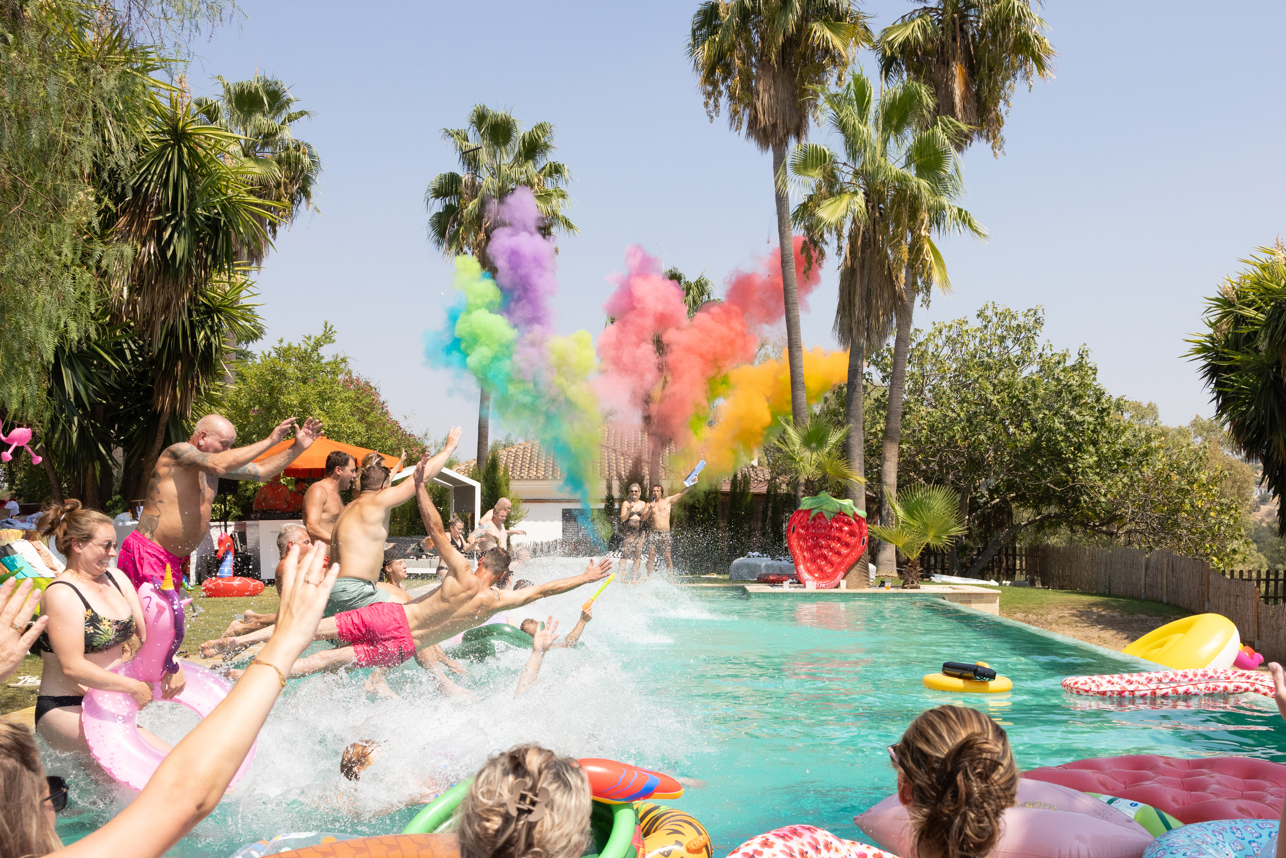 Tijdens de knotsgekke poolparty dreef het zwembad bijna voller met opblaasitems dan met water.